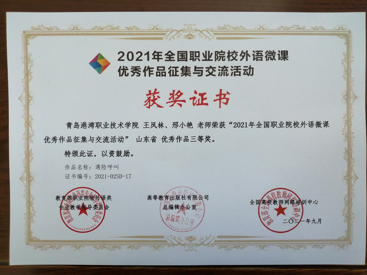 荣誉榜 当前位置: 首页 >> 荣誉榜 >> 正文 2021年全国职业院校外语微课优秀作品征集与交流活动山东省优秀作品三等奖 发布日期:2021-10-13 点击: 上一篇:于波、王作鹤同学荣获“第四届山东省老员工船艇设计技能大赛”二等奖