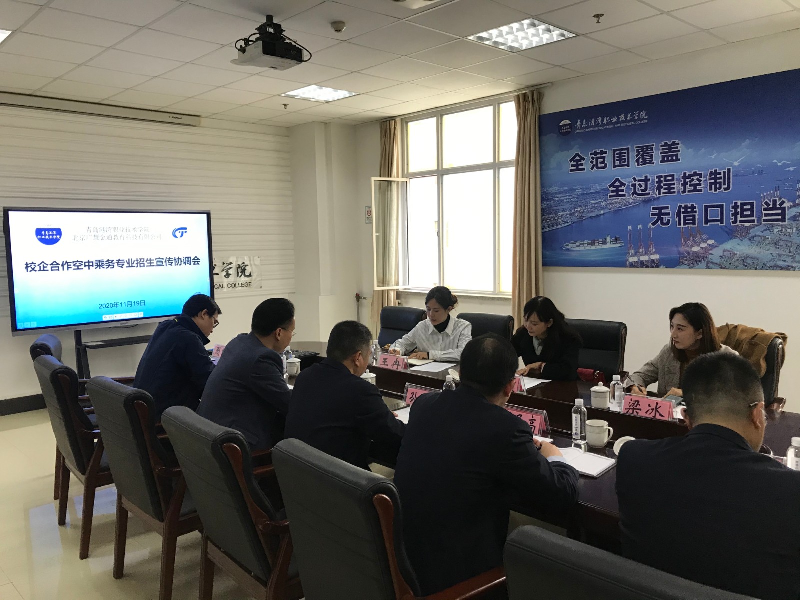 11月19日上午,校企合作空中乘务专业招生宣传协调会在A0-A718会议室举行。北京广慧金通教育科技有限公司山东区域总经理王艳霞、副总经理王冉、教师梁冰、学校人才招聘办公室副主任房坤、海事公司党支部副书记刘子高,以及招就办、教务处相关老师参加了会议,会议由海事学院经理孙增华主持。