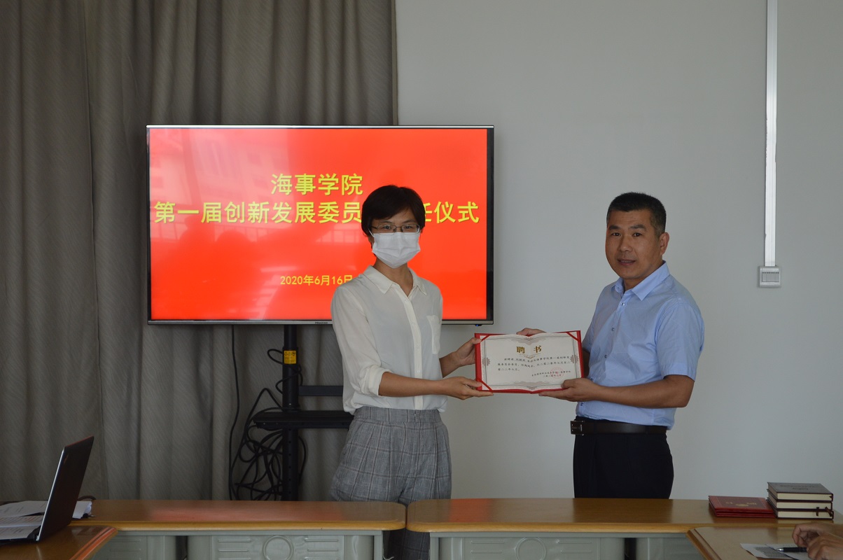 本次会议共有三项议题。首先由聂涛宣读海事学院创新发展委员会章程,并公布第一届委员会委员名单,孙增华经理为委员颁发聘书。本次创新发展委员会的成立,是海事学院努力提升办学质量,加强内涵建设和未来发展的一项重要举措,委员会委员将在提升教师教学能力、教科研立项、课程建设、专业发展、校企合作和对外交流等方面,群策群力,公正评审,科学指导,带动海事学院创新发展。