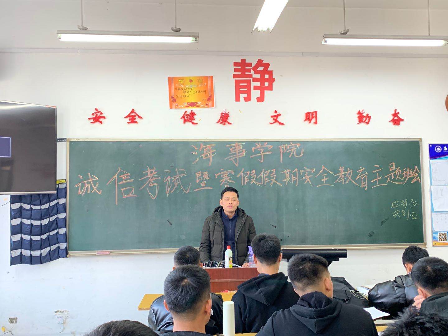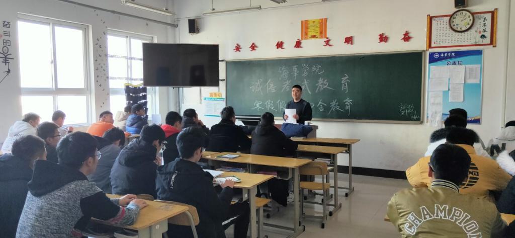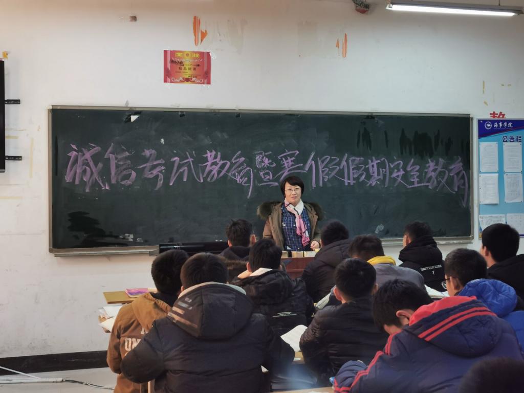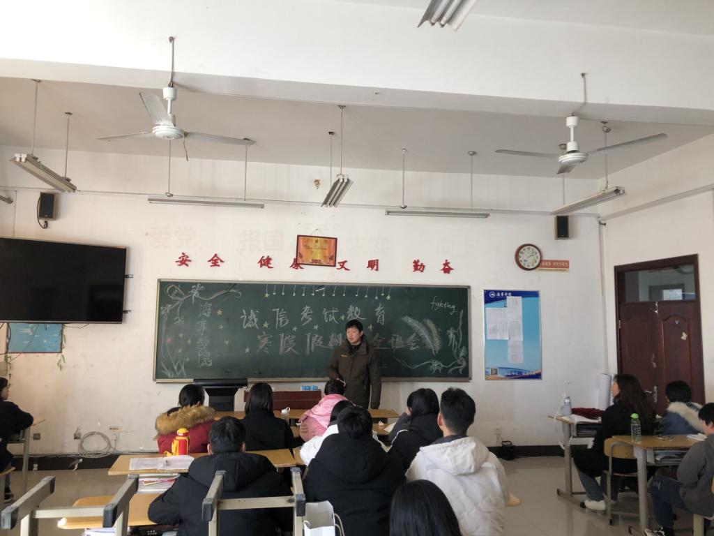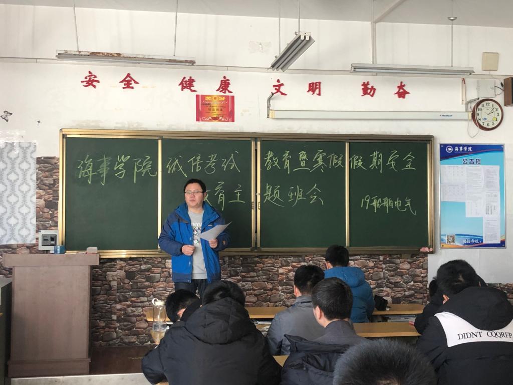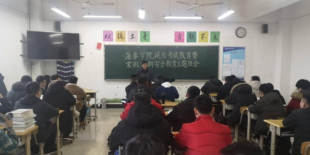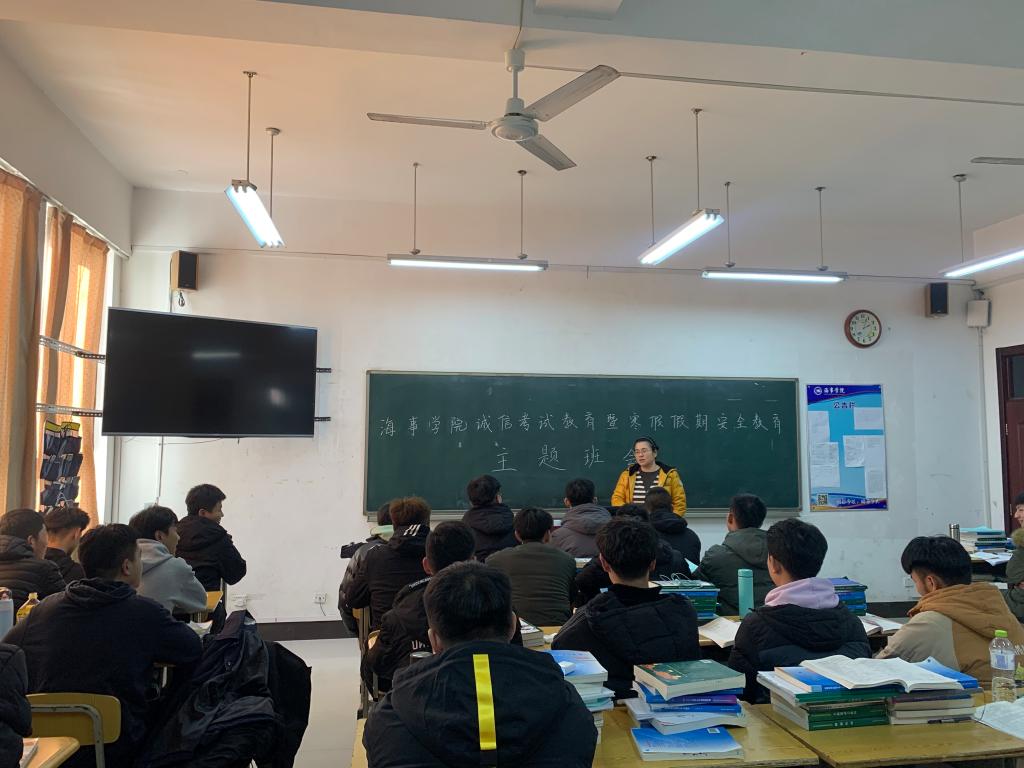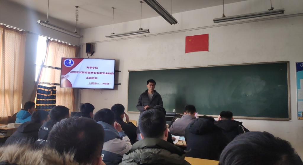 12月31日,海事学院组织召开诚信考试教育暨寒假假期安全教育主题班会,辅导员、班主任深入班级参加班会。