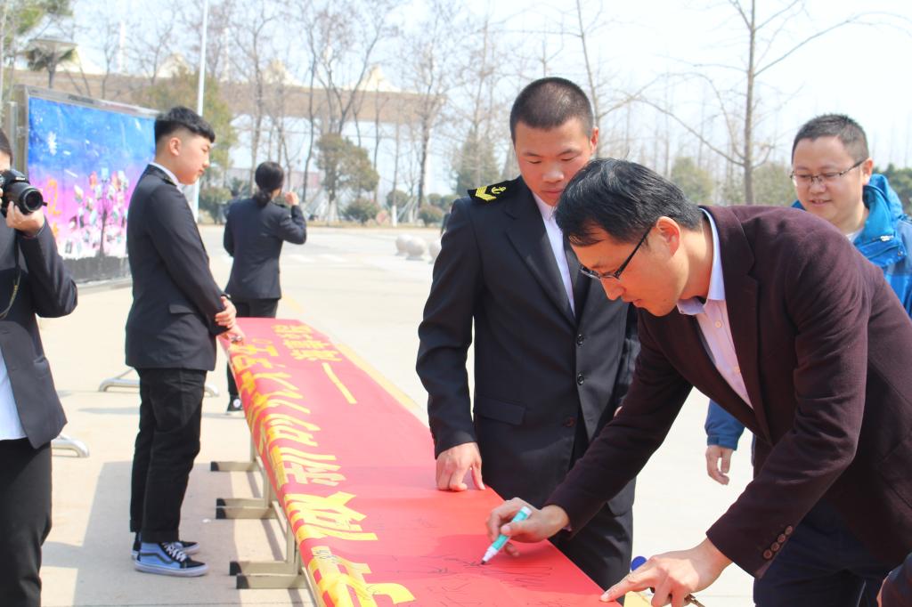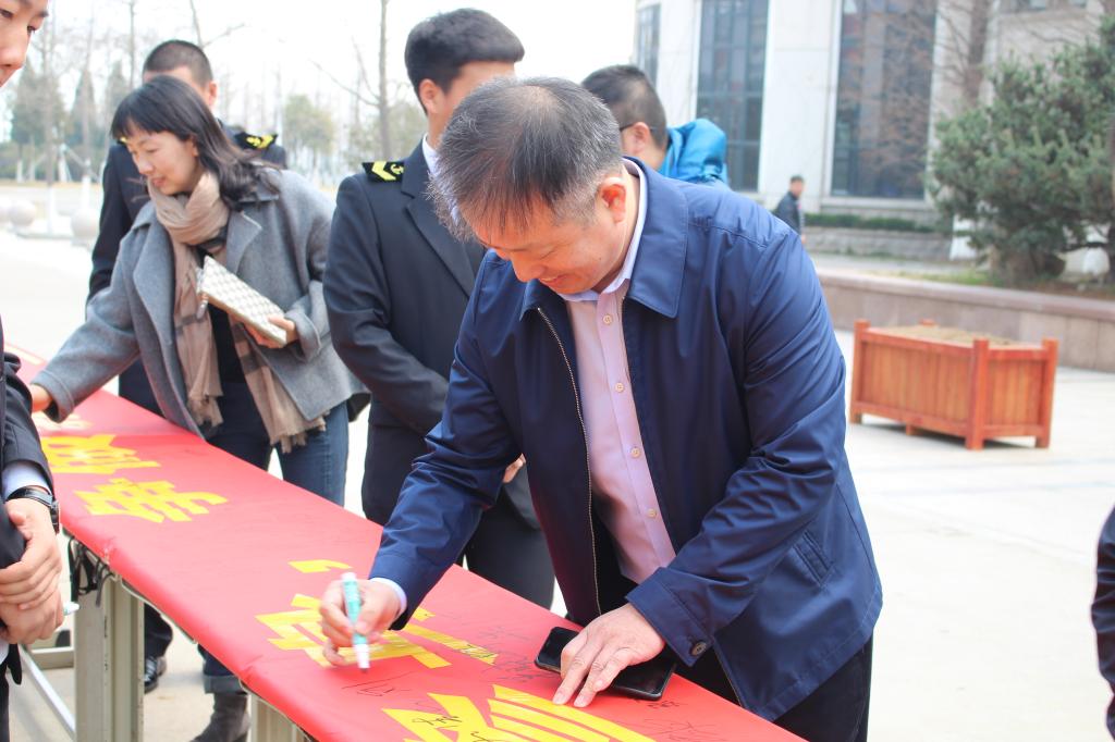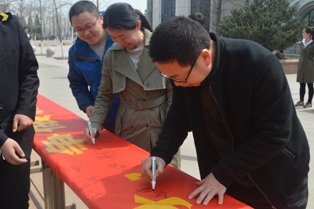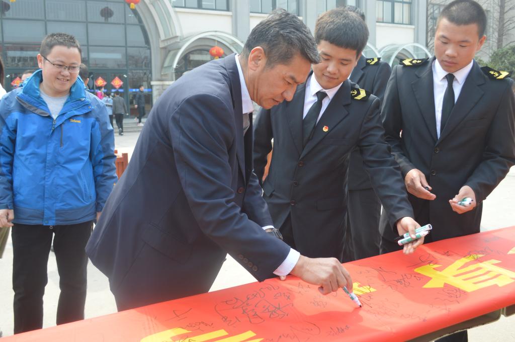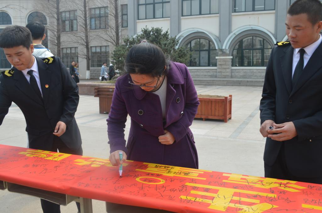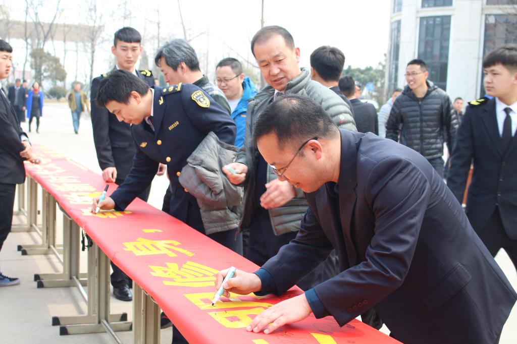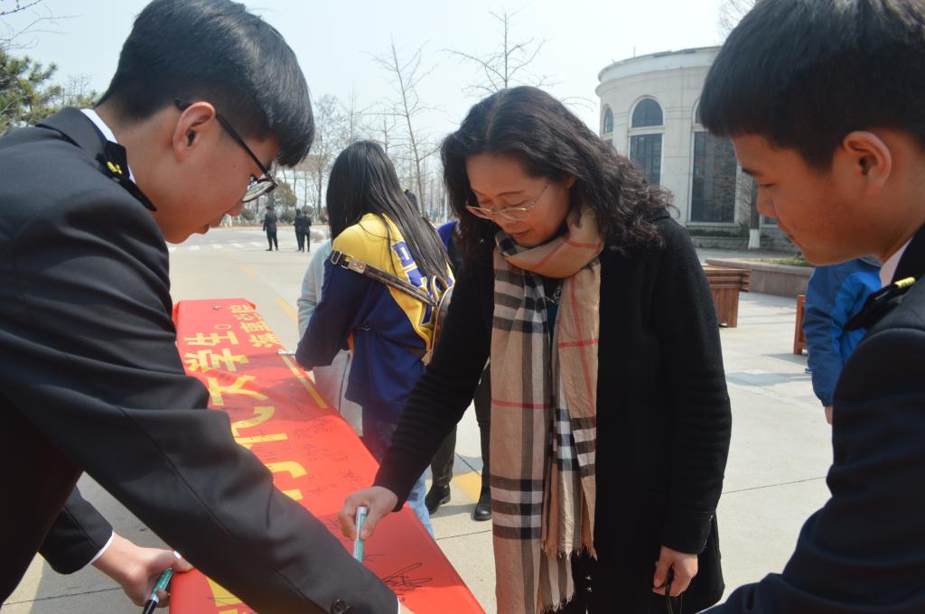 活动开始,员工干部积极向周围的同学介绍此次活动的意义,来校评估的海事局领导、校领导以及各学院领导、老师纷纷加入签名活动,同学们也积极踊跃地在横幅上签下自己的名字。