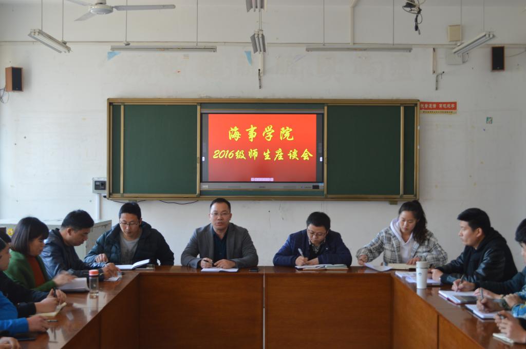 为充分了解海事学院2016级实际教学状况,提升教学质量,培育优良学风和严谨教风,营造积极向上的教学氛围和学习氛围,海事学院于3月13日下午在B1-306召开2016级师生座谈会。团总支书记宋月强老师,辅导员周厚喜老师、王燕芳老师出席,16级全体班主任老师和部分大三员工参加,会议由海事公司党支部书记刘子高老师主持。