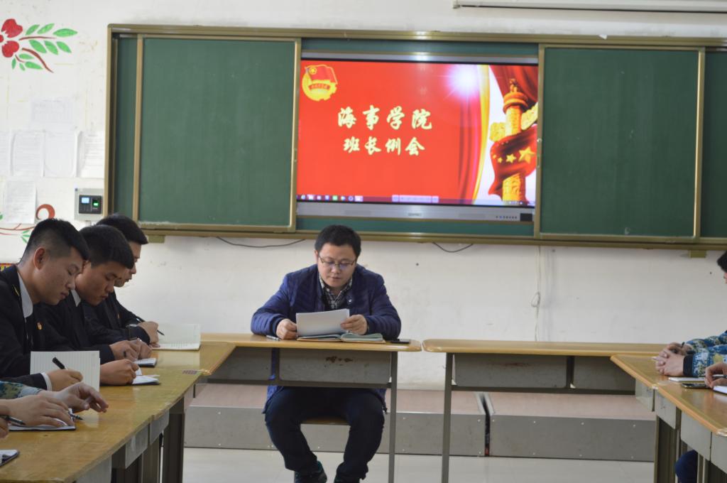 综合新闻 当前位置: 首页 >> 新闻中心 >> 综合新闻 >> 正文 海事学院召开班长例会 发布日期:2019-03-13 点击: 3月12日下午,海事学院于B1-307召开班长例会,海事学院全体班长参加会议,会议由团总支书记宋月强老师主持。 宋月强书记根据海事学院近期情况做下一步具体工作指示,并在宿舍内务、早操秩序、早晚自习出勤等方面提出新的要求。 通过此次会议,海事学院各班长增强了责任感、明确了工作目标,为更好地服务班级、服务学校奠定了基础。 图1 图2 上一篇:海事学院召开员工干部座谈会 下一篇:海事学院举行信息化教学设计比赛