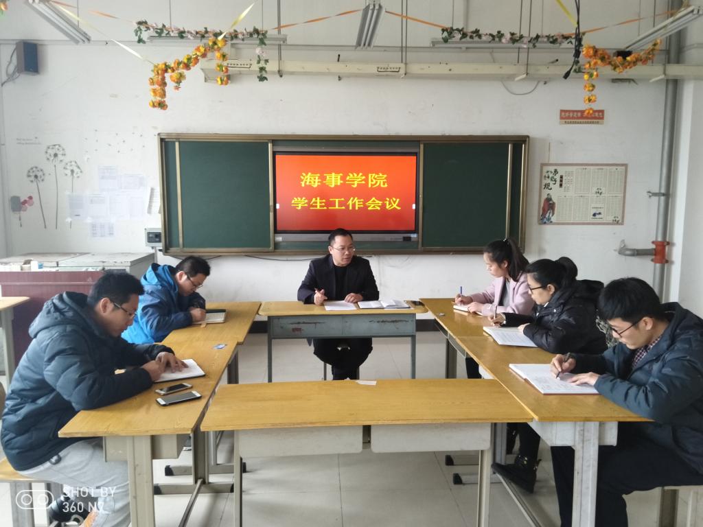 综合新闻 当前位置: 首页 >> 新闻中心 >> 综合新闻 >> 正文 海事学院召开员工工作会议 发布日期:2019-02-27 点击: 2月27日下午,海事学院在B1-316召开员工工作会,全体辅导员老师参加会议,会议由党支部书记刘子高主持召开。 首先,团总支书记宋月强及全体辅导员老师对分管工作做简要汇报。其次,宣布刘倩老师工作对接的具体安排。最后,刘子高书记就两个秩序恢复、员工会融合、重点关注员工工作、宣传工作、雷锋月活动五个方面做了具体部署,并对今后海事学院员工工作的运行提出了具体要求。 通过此次员工工作会议,使全体辅导员老师统一了思想,明确了目标,为海事学院员工工作的品牌化发展奠定了基础。 图1 上一篇:海事公司党支部召开支部大会 下一篇:海事学院新年首期值班水手值班机工开班