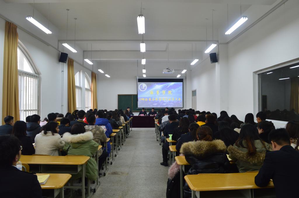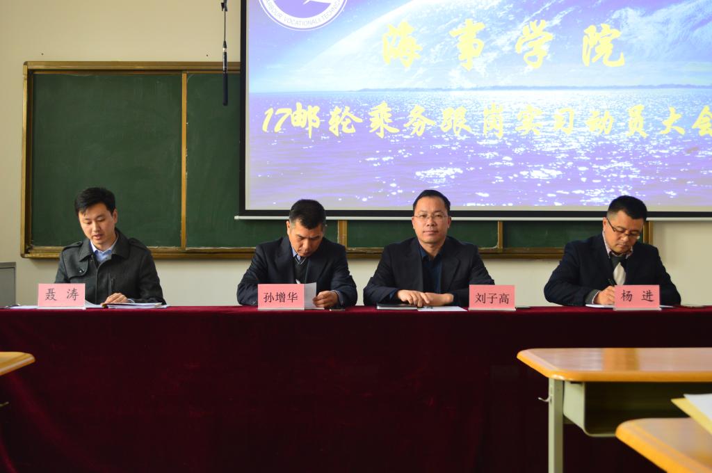 2月25日上午,海事学院在B4-106召开17级国际邮轮乘务管理专业跟岗实习动员大会。出席会议的有海事学院经理孙增华,党支部书记刘子高,经理助理聂涛,教务处杨进老师,以及部分实习指导老师和全体17级国际邮轮乘务管理专业的同学。会议由海事公司党支部书记刘子高主持。
