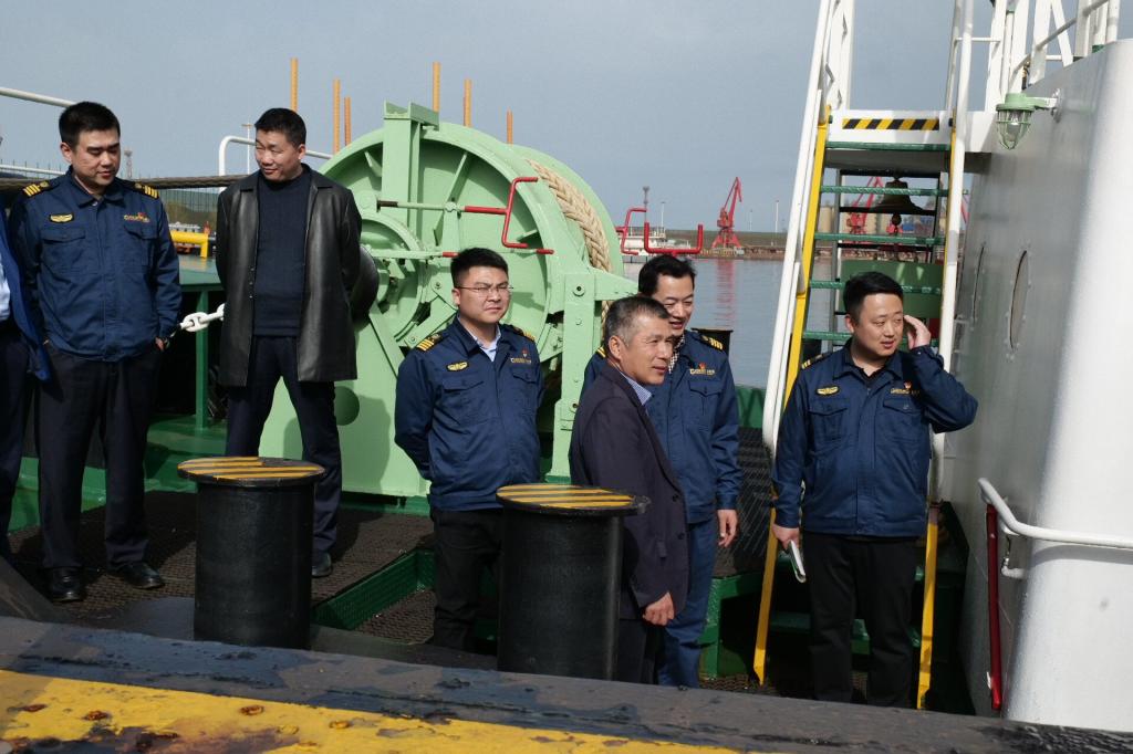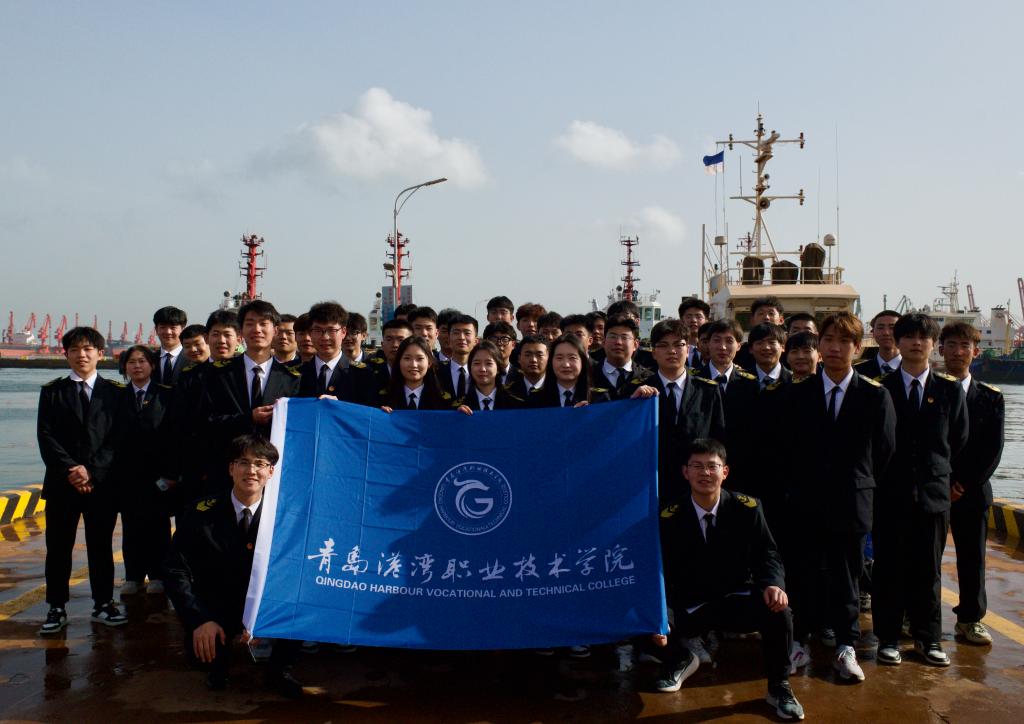 仪式结束,师生共同参观山东港口职工赋能基地,在拖轮码头,登上“日港拖12”轮参观拖轮驾驶台和机舱,在轮驳公司工作的优秀毕业生亲自给同学们进行讲解,并演示业务绝活。