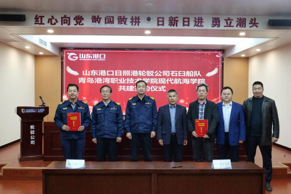 在座谈交流过程中,孙增华与周扬锋分别介绍相关情况,就人才培养、岗位供需、科技服务等进行深入交流,周扬锋对学院培养输送的毕业生高度的认可,对产业学院建设充满期待和信心。公司党总支与日照港轮驳公司石臼船队党支部举行结对共建签约仪式,田忠义与石臼船队党支部书记牟炜代表各自支部进行签约,师生共同观看日照港轮驳公司的宣传片,了解日照港轮驳公司的历史沿革、企业文化及未来展望。
