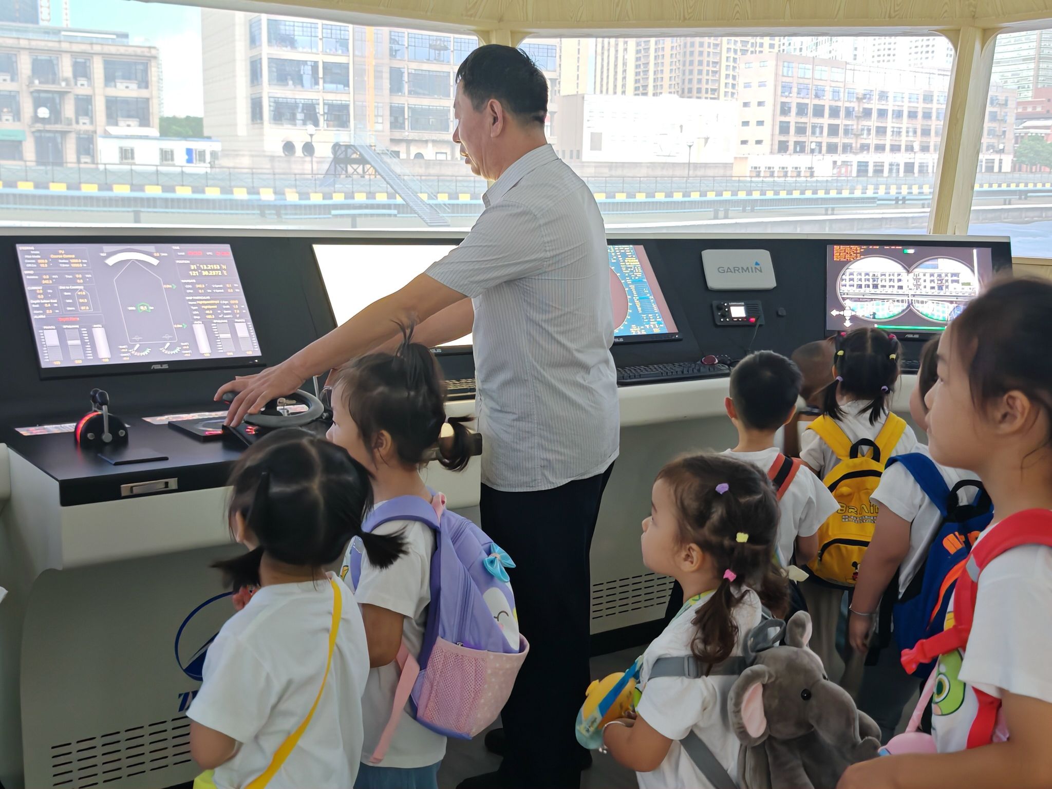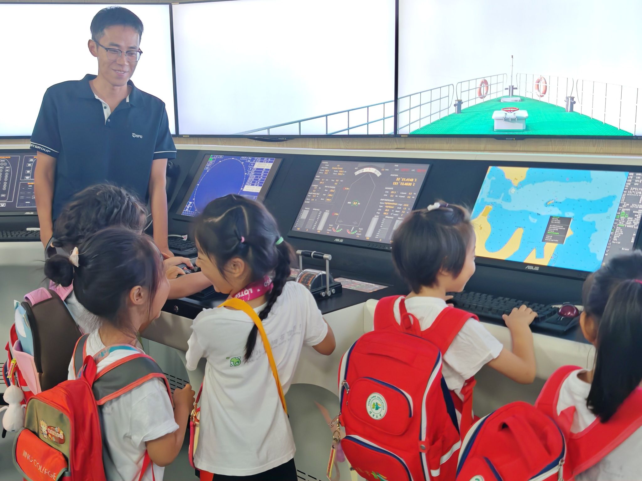 在“蒲公英”科普名家谯兴朋船长的带领下,小朋友参观了学院产教融合大厅、航海职业文化体验馆和飞机模拟舱,孩子们聆听讲解,了解了港口和航运的各类知识,感受航海文化的魅力。随后,孩子们来到航海模拟器,亲手驾控船舶航行,沉浸式体验驾驶船舶、感受乘风破浪,激发了孩子们对海洋和航海事业的热爱。