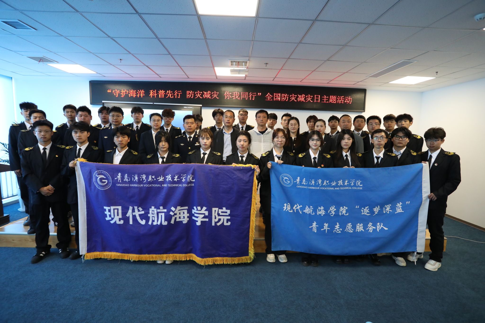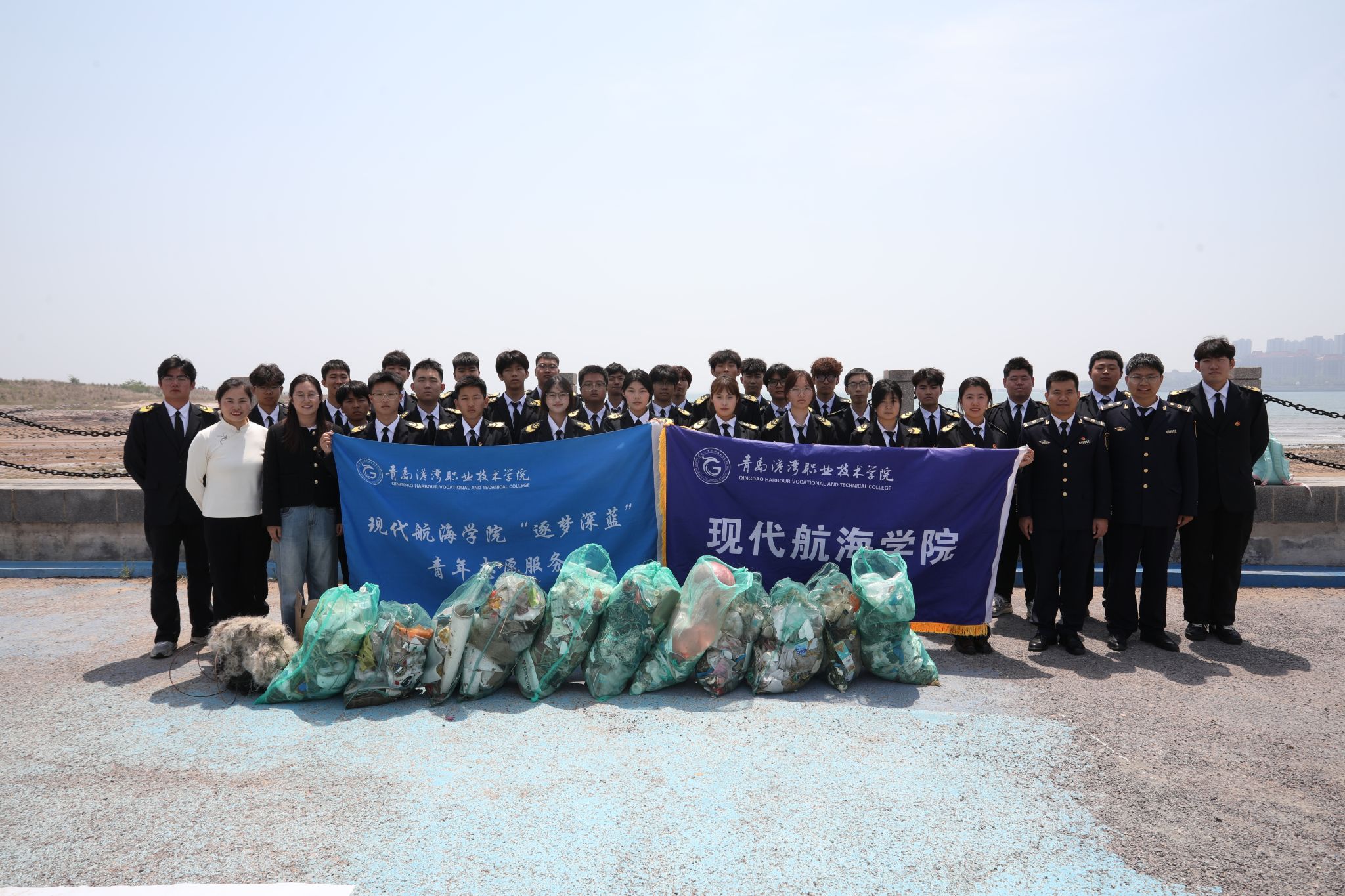 志愿者们抵达“海洋十年”国际合作中心展馆,通过图文影像资料与专家讲解,全景式学习该机构在国际海洋治理中的战略布局与创新实践,鲜活案例让青年学子深刻体会到中国在全球海洋治理中的智慧贡献。自然资源部北海预报减灾中心正高级工程师焦艳博士出席并进行《山东省海洋灾害特征与防灾减灾》主题报告,随后董家口海事局指挥中心副主任李西战对《商渔船防碰撞安全指引》进行讲解。公司志愿者积极进行提问,课堂氛围热烈。科普学习结束后,学院志愿者抵达贝壳桥海岸开展净滩活动。以小组为单位清理潮间带垃圾,收集塑料废弃物、渔网残片等海洋垃圾,把保护海洋的决心化作行动。 接着,员工代表陈钰带领大家面向大海庄严宣誓,公司志愿者纷纷表示:“作为未来的航海从业者,我们不仅要掌握船舶操控技术,更要成为海洋生态保护的行动者。”