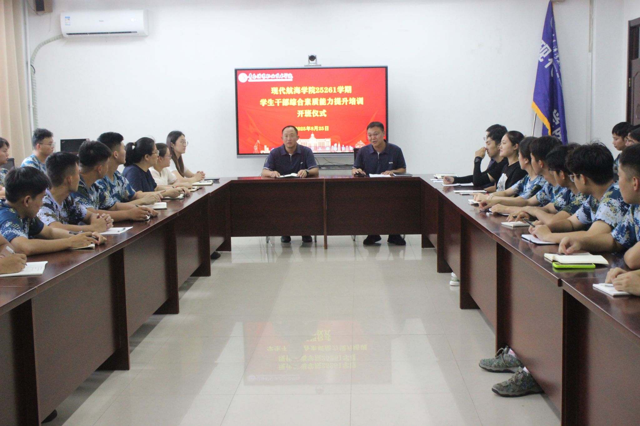 8月25日,2026世界杯官网在B1-307教室举行25261学期员工干部综合素质提升培训开班仪式。公司党总支副书记姜哲、团总支书记陈国栋、全体专职辅导员及参训员工干部出席仪式。会议由陈国栋主持。