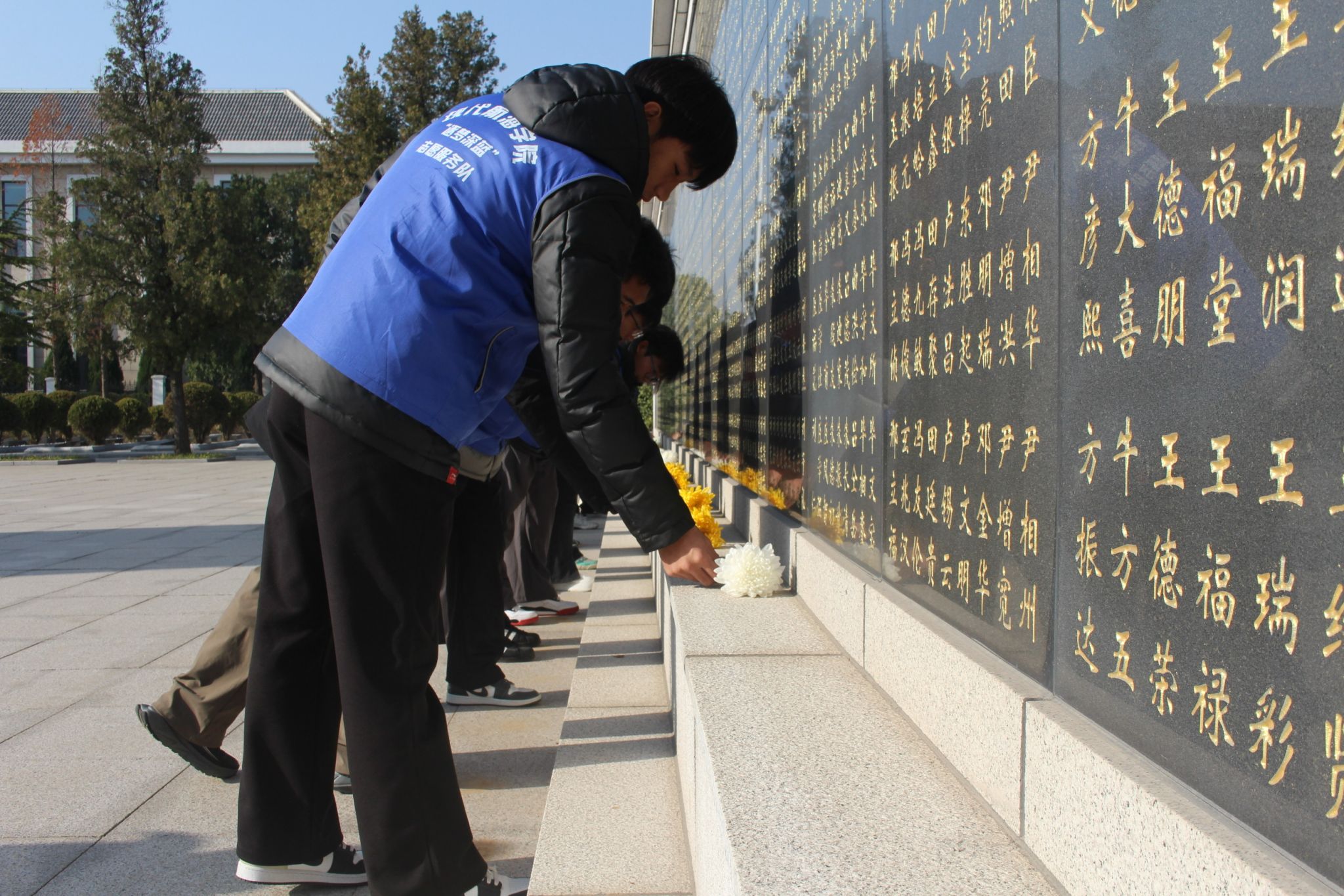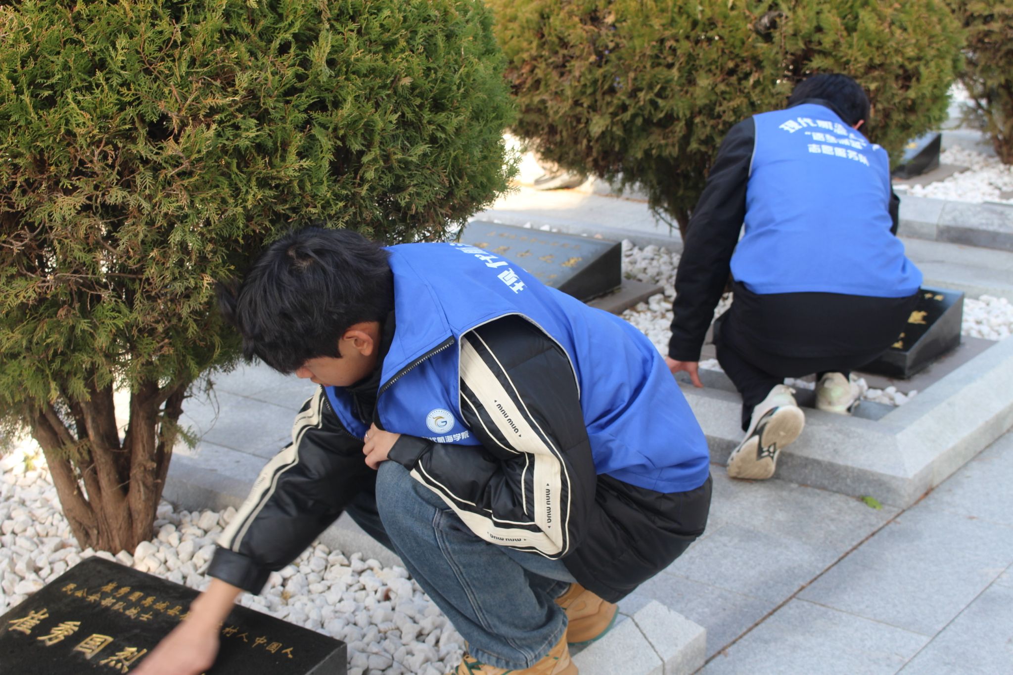 活动中,志愿者们怀着对英烈的深切缅怀,认真投入到陵园环境维护工作中,大家分工协作,细致擦拭烈士墓碑与纪念设施,清扫落叶杂草,使园区环境更加庄严肃穆。在清洁整理的过程中,同学们以实际行动表达对先烈的敬仰,进一步坚定了传承红色精神、担当时代使命的信念。随后,全体人员在革命纪念碑前整齐列队,手持鲜花肃立默哀,深切追忆英烈浴血奋战的峥嵘岁月,感悟今日和平生活的来之不易。默哀仪式结束后,志愿者们走进烈士纪念馆,通过观看历史陈列与文物资料,深入学习英雄事迹,在重温革命历程中筑牢信仰根基、厚植爱国情怀。