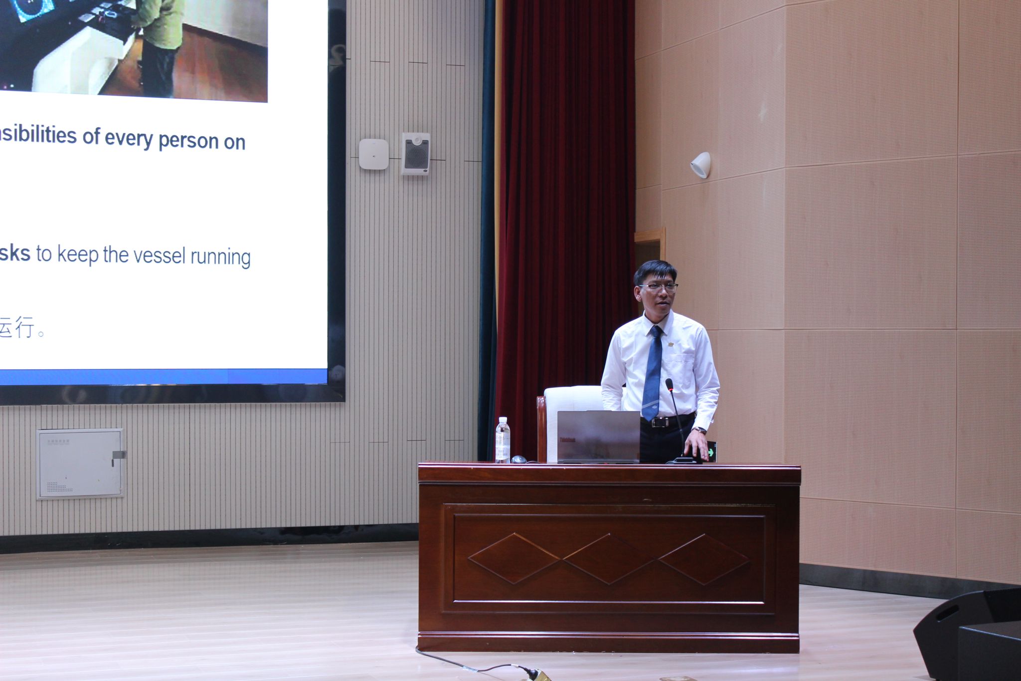 Min Min Thant,缅甸船长,为洲际船务集团驻缅甸代表,从事船员培训与管理工作,以《船员上船前要具备的基本素养》为题,为同学们带来了精彩讲座。宣讲会上,船长结合多年航海实践经验,系统介绍了海员职业体系与船舶运行管理机制,阐述了航海领域主要岗位的职责分工与部门协作模式。他强调,航海工作专业性强、环境特殊,从业人员需具备良好的身体与心理素质,严格遵守操作规程,切实保障航行安全。此外,船长还就航海职业发展路径、行业人才需求及相关资格证书考取等内容进行了说明,鼓励同学们扎实学习、积极关注航海事业发展。在互动环节,参会师生围绕海员培养、职业发展等问题积极提问,船长结合自身经历解答,现场交流气氛热烈。