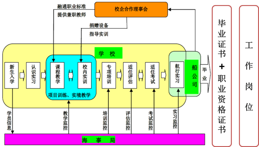 根据国际海事组织(IMO)、教育部、中国海事局的相关要求,以海船船员轮机岗位职业能力培养为主线,将国际海船船员职务适任标准融入到日常教学中,实施学历教育与职业资格教育相融合的“三方共育、书证融通”人才培养模式(见图6)。
