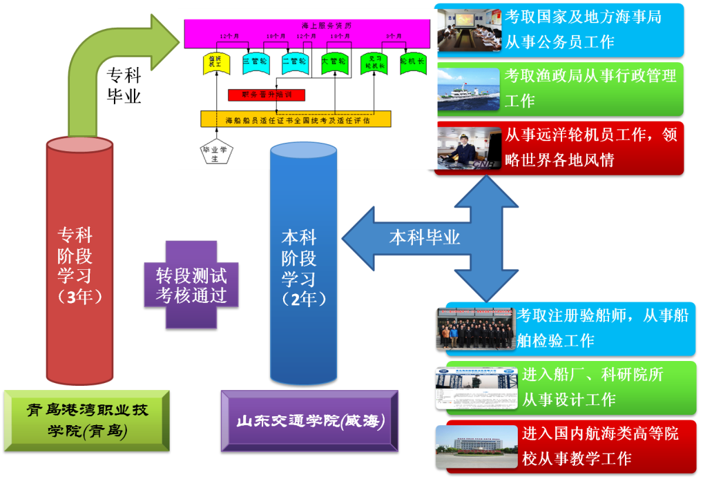毕业后通过专升本及研究生考试,可进入国内知名航海类高校学习深造。