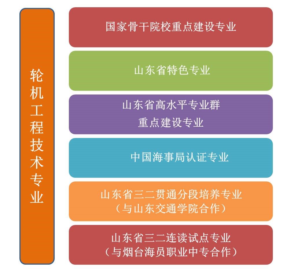 轮机工程技术专业是国家骨干院校重点建设专业、山东省省级特色专业、山东省高水平专业群重点建设专业、中国海事局认证专业、山东省三二贯通分段培养试点专业(与山东交通学院合作)、山东省三二连读试点专业(与烟台海员职业中等专业学校合作),牵头开发山东省轮机工程技术专业教学指导方案(见图1)。